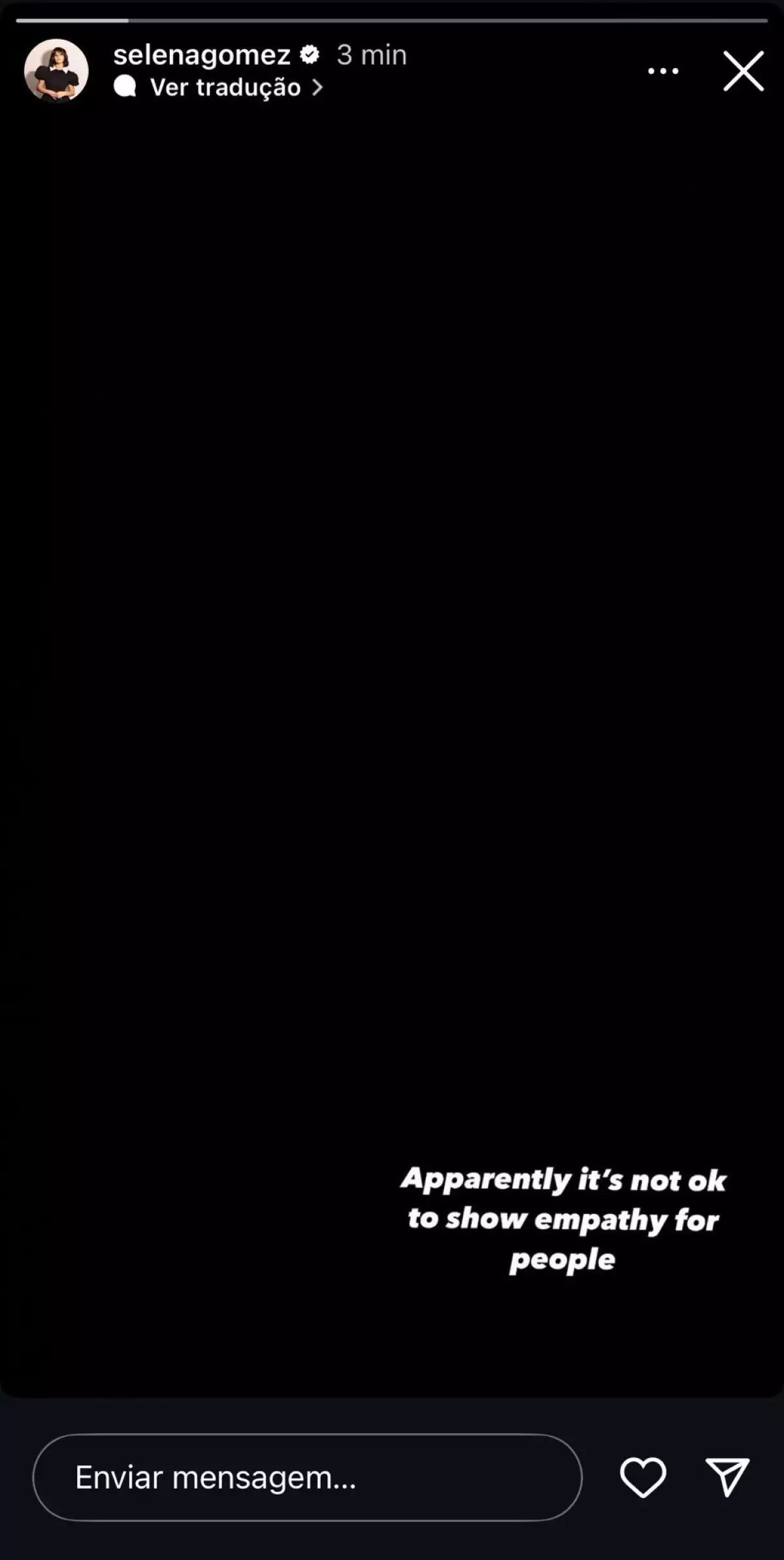 Minutos más tarde, Selena regresó a historias para compartir el mensaje "aparentemente no está bien mostrar empatía por otras personas" tras presumiblemente, recibir críticas ante su primer mensaje. Esta segunda publicación también fue eliminada.