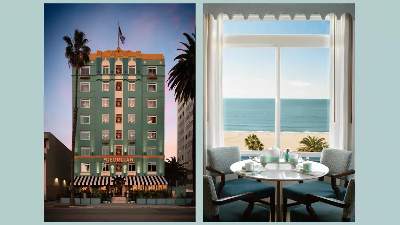 La ciudad de Los Ángeles siempre nos recordará a las celebridades más grandes del mundo, pero hospedarse allí y sentir que vives como una de ellas es una experiencia incomparable. Cuando Rosamond Borde soñó con abrir este hotel, su intención fue que la fachada turquesa art déco destacara sobre Ocean Avenue, con 84 habitaciones, la mayoría de ellas con vista al mar. Al entrar, el diseño te transporta a otra época, con elementos originales restaurados como techos altos, relieves decorativos y lámparas a medida. Te sientes literalmente dentro de una película de Wes Anderson, con colores suaves, simetría y ese encanto nostálgico. La magia perdura gracias a que los hoteleros Jon Blanchard y Nicolo Rusconi lideraron la transformación del edificio, respetando su esencia sin perder el espíritu original, logrando así capturar el glamour del pasado con las comodidades del presente.