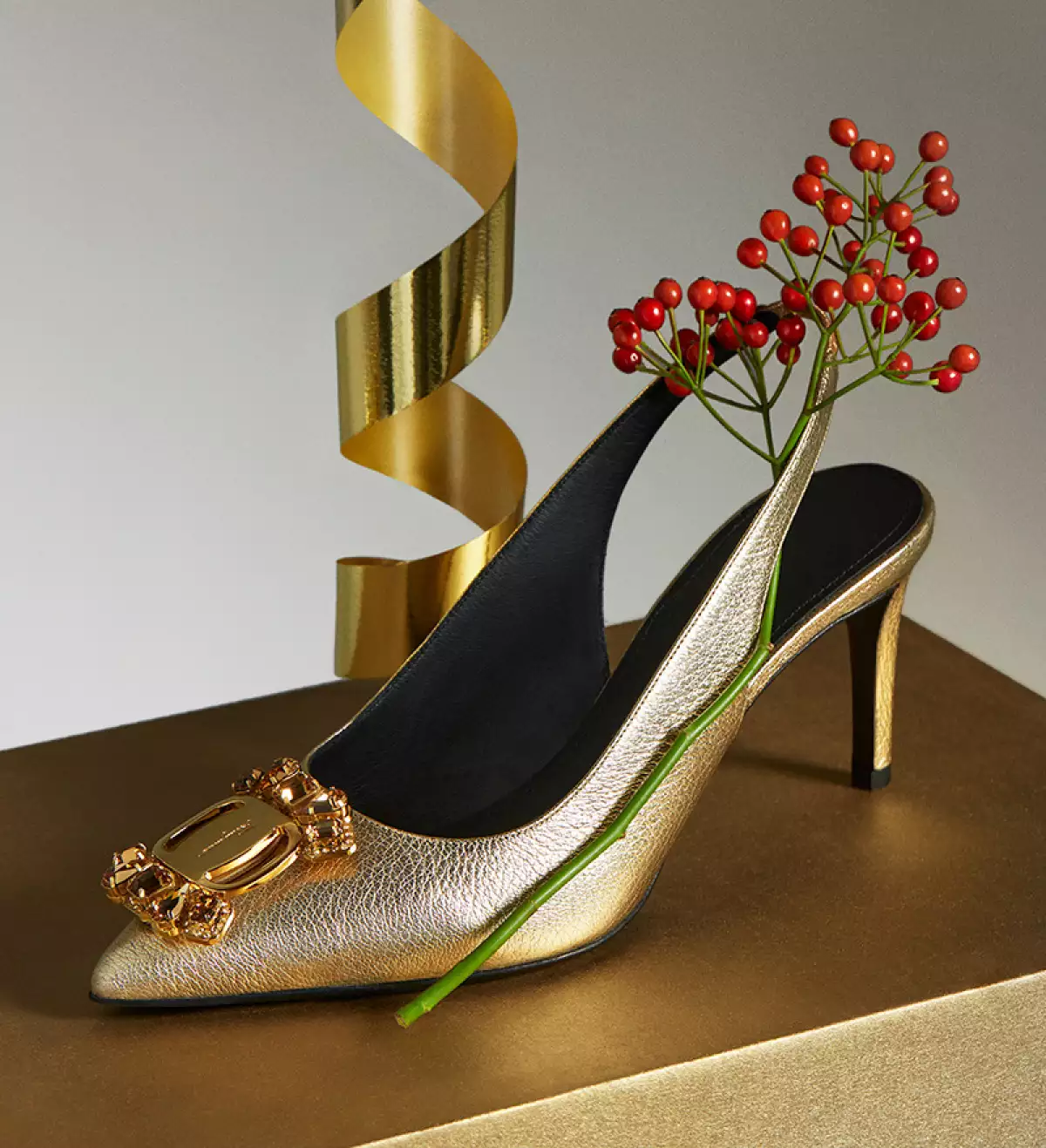 En esta campaña las manos juegan un papel importante porque representan la acción de dar y recibir, pero nada de esto estaría completo sin los sorprendentes fuegos artificiales llenando de resplandor cada pieza. Los tejidos metálicos, sastrería modernista, cadenas de oro y zapatos de tacón, no pueden faltar para ellas. Tampoco pueden quedar fuera del árbol de regalos los diseños de Viva Bow con el icónico moño en negro y dorado.
